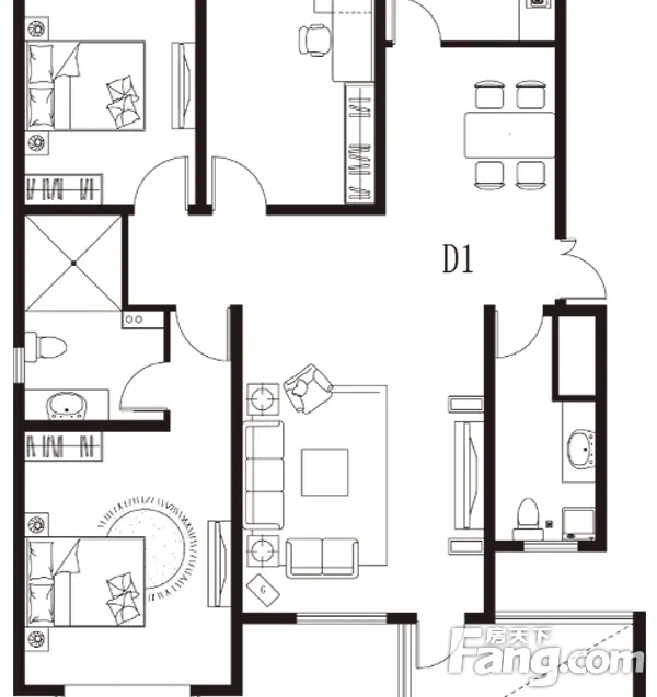 此房为3-2厅的户型2卫,阳面客厅,客厅两侧分别是卧室,客厅餐厅通透,厨房还有一个储物间。南北卧室通透。